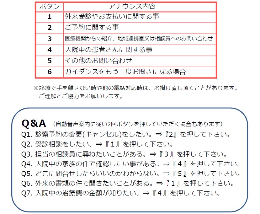 自動音声ガイダンスの導入に伴い、当院にお電話をいただく際には、自動再生されるガイダンスに従い、番号を押していただくことで、関係部署につながるようになります。